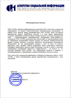 ООО «НУЛЛ» является добросовестным партнером АНО «Агентство социальной информации» по проекту «Налогообложение некоммерческих организаций». В рамках этого проекта перед программистами ООО «НУЛЛ» была поставлена амбициозная задача: разработать простую и в тоже время эффективную структуру управления консультативным онлайн-центром по весьма специфичной теме - налогообложение некоммерческих организаций (www.nalognko.ru). Сотрудники ООО «НУЛЛ» выполнили весь объем работ от проектирования сайта до управления посещениями готового ресурса на высоком профессиональном уровне. Следует отметить и высокую надежность используемого программного обеспечения. За год существования ресурса в сети не было ни единого серьезного сбоя системы. Работа редакторов сайта существенно облегчена благодаря чрезвычайно простой схеме публикации текстов на сайте и внесения необходимых исправлений. Простота и эффективность - это именно то, что отличает решения ООО «НУЛЛ». Это утверждение касается и дизайна, и программирования, и продвижения, и администрирования проекта в целом. АНО «Агентство социальной информации» собирается продолжить работу с ООО «НУЛЛ» и может рекомендовать другим предприятиям сотрудничество с этой компанией.