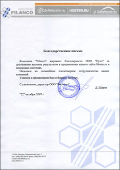 Компания «Filanco» выражает благодарность ООО «Нулл» за достижение высоких результатов в продвижении нашего сайта Hoster.ru в поисковых системах.