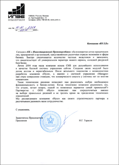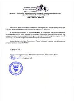 Настоящим выражаем свою искреннюю благодарность и признательность студии «NULL», являющейся нашим постоянным партнером по IT проектам. За время сотрудничества со студией «NULL», её сотрудники, и в частности Сергей Андреевич Круглов, а также Максим Вячеславович Дьяконенко зарекомендовали себя как специалисты самого высокого уровня, которые неоднократно помогали решать задачи любой сложности в области IT сопровождения деятельности нашей компании. Юридическое агентство «Интеллект и Право» выражает надежду на продолжение сотрудничества со студией «NULL».