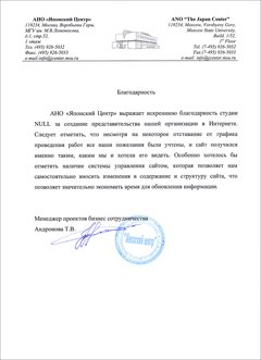 АНО «Японский Центр» выражает искреннюю благодарность студии NULL за создание представительства нашей организации в Интернете. Следует отметить, что несмотря на некоторое отставание от графика проведения работ все наши пожелания были учтены, и сайт получился именно таким, каким мы и хотели его видеть. Особенно хотелось бы отметить наличие системы управления сайтом, которая позволяет нам самостоятельно вносить изменения в содержание и структуру сайта, что позволяет значительно экономить время для обновления информации.