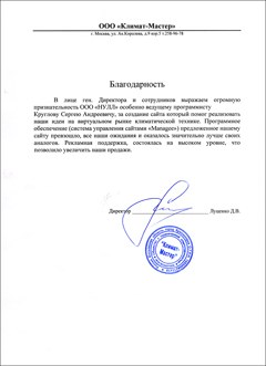 В лице ген. Директора и сотрудников выражаем огромную признательность ООО «НУЛЛ» особенно ведущему программисту Круглову Сергею Андреевичу, за создание сайта который помог реализовать наши идеи на виртуальном рынке климатической технике. Программное обеспечение (система управления сайтами «Managee») предложенное нашему сайту превзошло, все наши ожидания и оказалось значительно лучше своих аналогов. Рекламная поддержка, состоялась на высоком уровне, что позволило увеличить наши продажи.