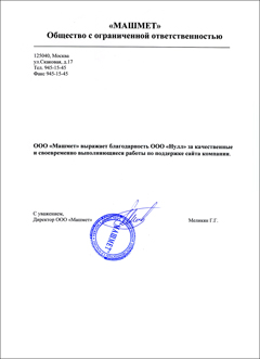 ООО «Машмет» выражает благодарность ООО «Нулл» за качественные и своевременно выполняющиеся работы по поддержке сайта компании.