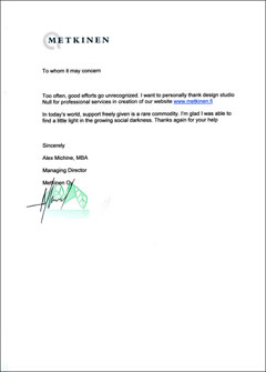 Too often, good efforts go unrecognized. I want to personally thank design studio Null for professional services in creation of our website www.metkinen.fi