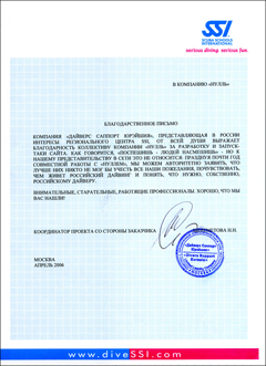 Компания «ДАЙВЕРС САППОРТ ЮРЭЙШИЯ», представляющая а России интересы регионального центра SSI, от всей души выражает благодарность коллективу компании «Нулл» за разработку и запуск-таки сайта. Как говорится «Поспешишь - людей насмешишь» - но к нашему представительству в сети это не относится: празднуя почти год совместной работы с «Нуллом», мы можем авторитетно заявить, что лучше них никто не мог бы учесть все наши пожелания, почувствовать, чем живет российский дайвинг и понять, что нужно, собственно, российскому дайверу. Внимательные, старательные, работящие профессионалы. Хорошо, что мы вас нашли!