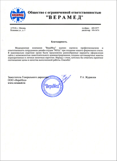 Медицинская компания «ВераМед» высоко оценила профессионализм и ответственность сотрудников дизайн-студии «NULL» при создании нашего фирменного стиля. В максимально короткие сроки были предложены разнообразные варианты оформления сайта с возможностью самостоятельного администрирования, созданы нестандартные макеты корпоративных и личных визитных карточек. Наряду с этим, хотелось бы отметить приятное соотношение цены и качества выполненной работы. Спасибо!