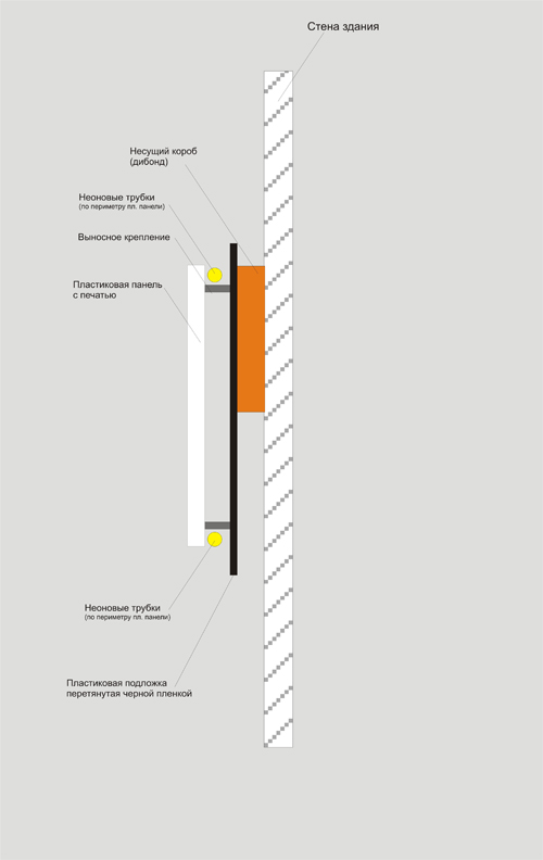 Детали: аппликация черной пленкой, узор в нижней части короба и треугольники правой и левой части короба. По контуру изображения девушки на африканском силуэте идет внутренний неоновый подсвет, местами детали изображения выходят за рамки и закрывают подсвет.